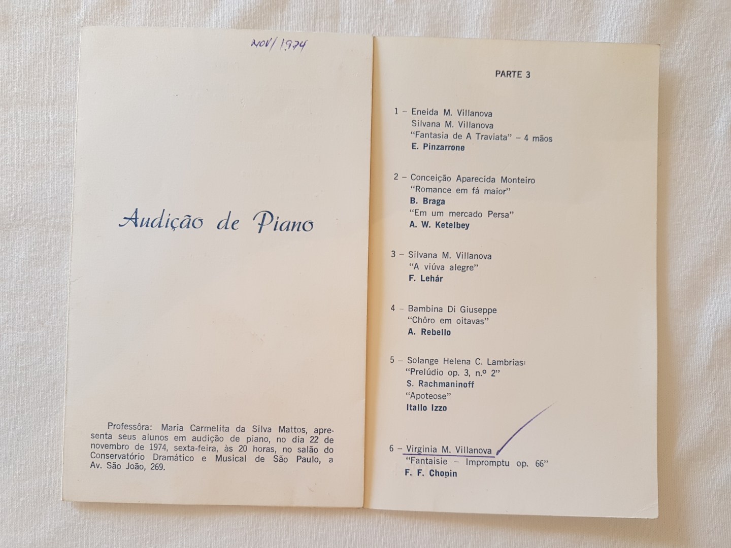 Audição de Piano – Conservatório Dramático e Musical de São Paulo (1974)